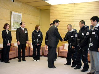 20071月24日、第16回冬季デフリンピック日本選手団を代表して、山根昭治団長、原田上主将、池田和明選手、鶴岡由佳選手、尾形裕基選手、瀬川事務局員が安倍晋三内閣総理大臣を表敬訪問しました。
