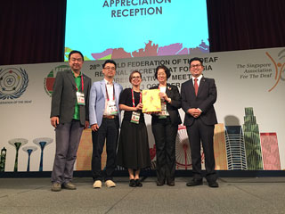 ![]() 全日本ろうあ連盟を代表し中西理事から アジア地域事務局を担っているマカオろう協会へ贈呈 |