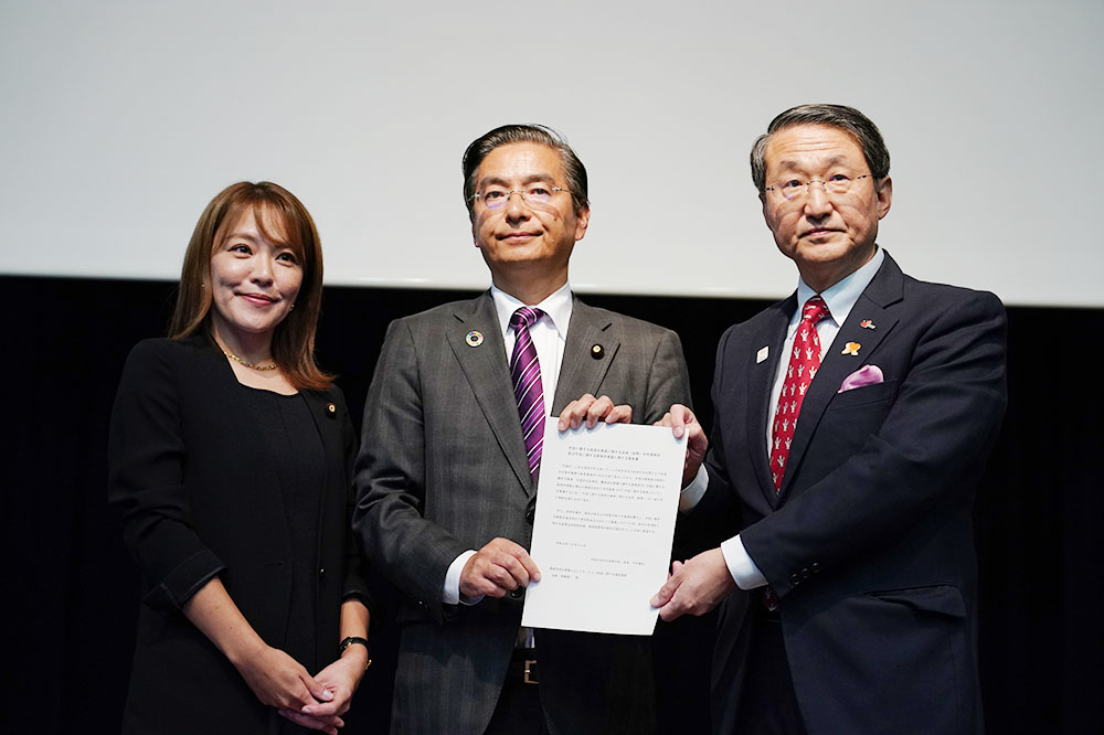 総会では、令和5年度事業報告と令和6年度事業計画(案)が承認された他、手話を広める知事の会会長の平井知事から、「法案の早期制定と手話に関する施策の推進に関する意見書」が障害児者の情報コミュニケーション推進に関する議員連盟 の山本博司幹事長、今井事務局長に手渡されました。