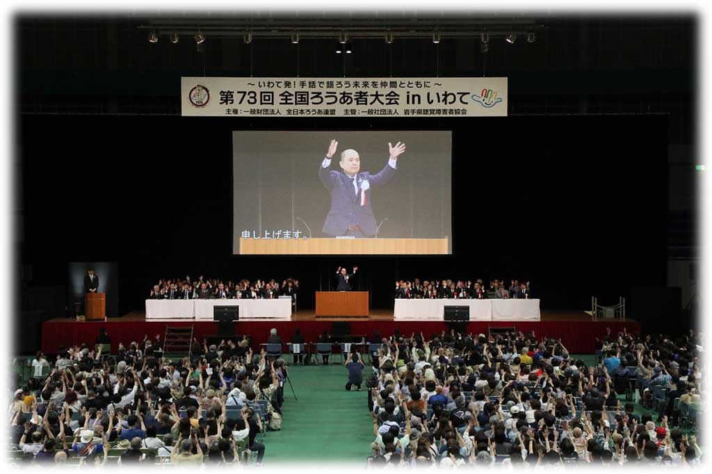The National Congress of the Deaf takes place every June, attracting about 2,000 to 3,000 participants from all over Japan. It aims to promote the social self-reliance and status of deaf people in Japan, improve welfare services for them, provide information on major deaf-related issues, and strengthen mutual cooperation. The General Assembly, held during the congress, adopts resolutions and policies on welfare, education, labor, etc., for the current fiscal year.
