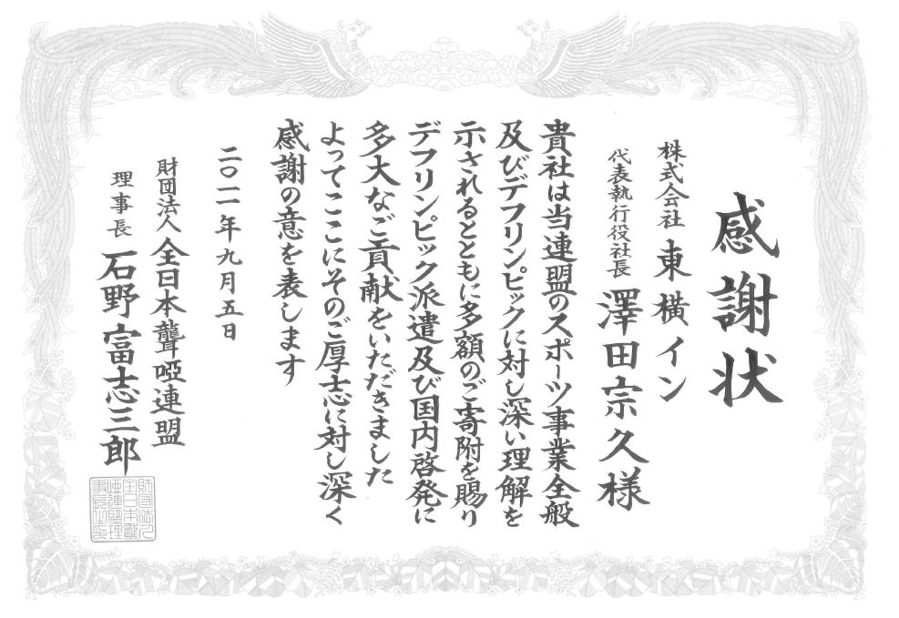9/5:全日本ろうあ連盟から東横インへ感謝状を贈呈 投稿日:2011年9月12日 作成者: 事務局 去る9月5日(月)、毎年連盟スポーツ事業に対して寄付を頂戴している東横インへ出向き、当連盟久松事務局長より感謝状を贈呈しました。 当連盟の出版物やデフリンピック関係のDVD等をお持ちし、お礼を申し上げるとともにこれからも引き続きのご支援をお願いしてまいりました。 また東横インからは、感謝状を役員会などで使用する会議室に飾っていただけるとのことです。 感謝状を贈呈 東横インへの感謝状(白黒写真) Tweet
