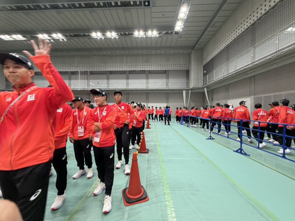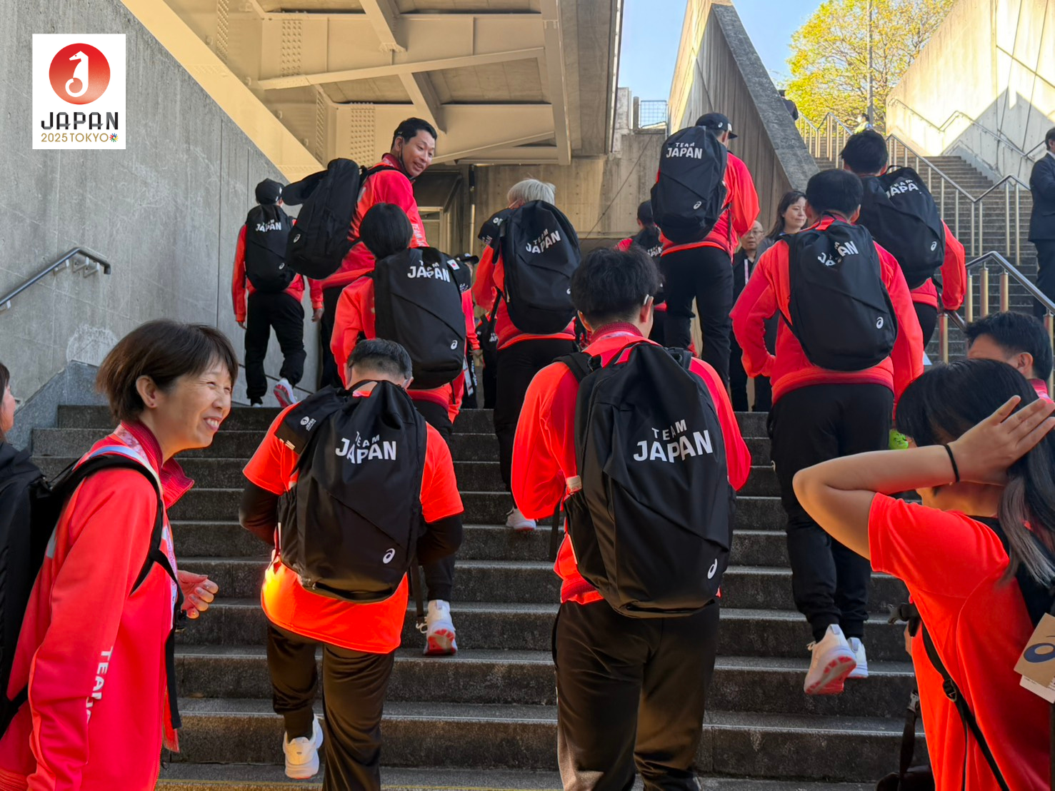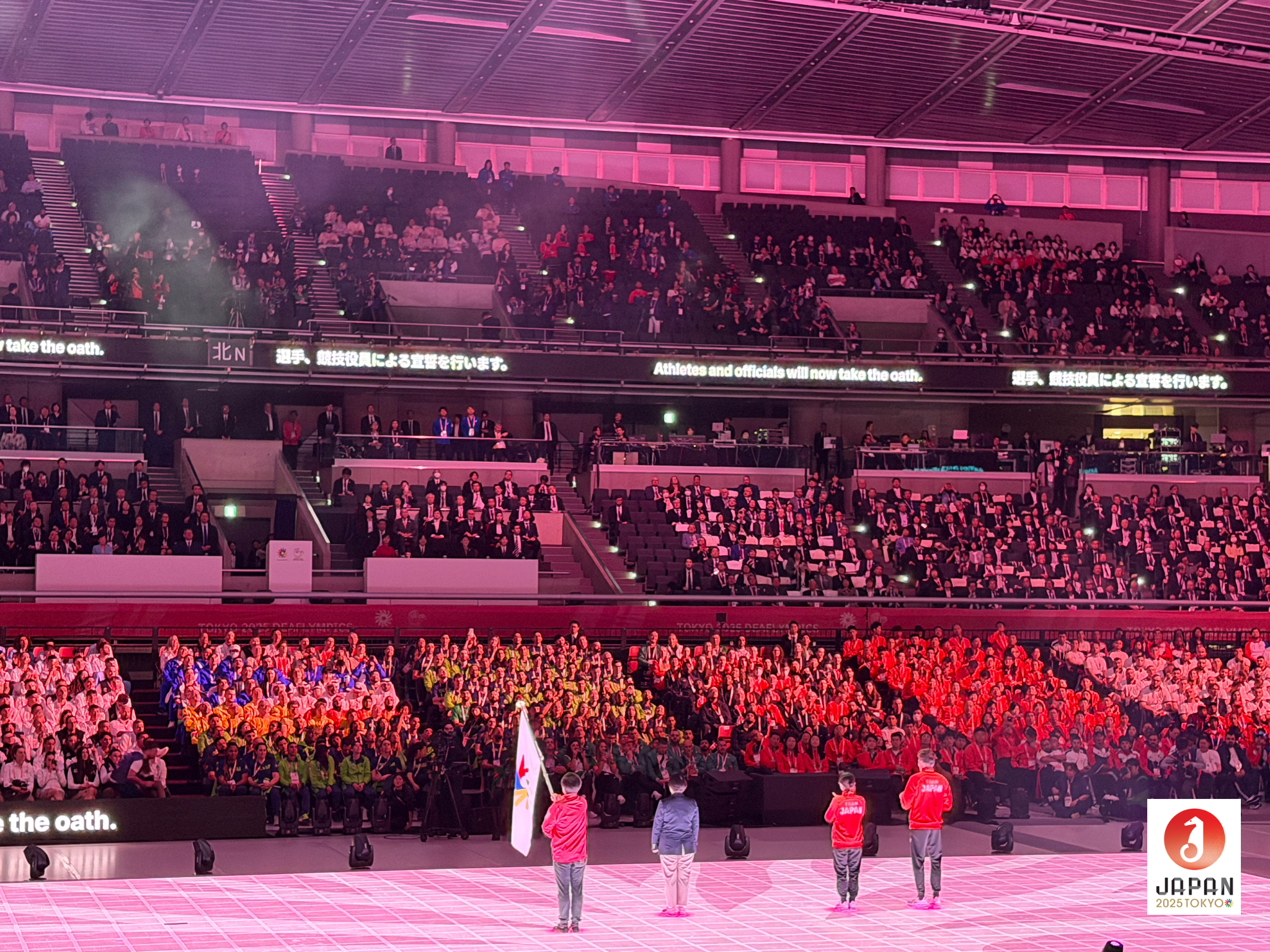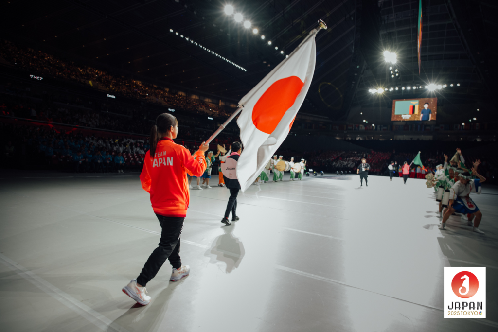 2025年11月20日 / 最終更新日時 : 2025年11月20日 稲葉智子 お知らせ 【開会式】11月15日 東京体育館 ■開会式 日本選手団は総勢で東京体育館の開会式に出席し、多くの観客に見守られながら 堂々と行進しました。 赤色のユニフォームを身にまとい、競技への熱い思いを胸に、 選手たちは笑顔で歩みを進めました。 先頭には旗手・小倉涼選手が立ち、日本選手団を力強く導きました。 バスで移動し、会場へ。 行進の前の様子 旗手 小倉涼選手を先頭に 燃えろ!ALL JAPAN! 横断幕を持って日本勢をPR 大きなスクリーンがあり、選手たちの様子が大きく映りました XCopy