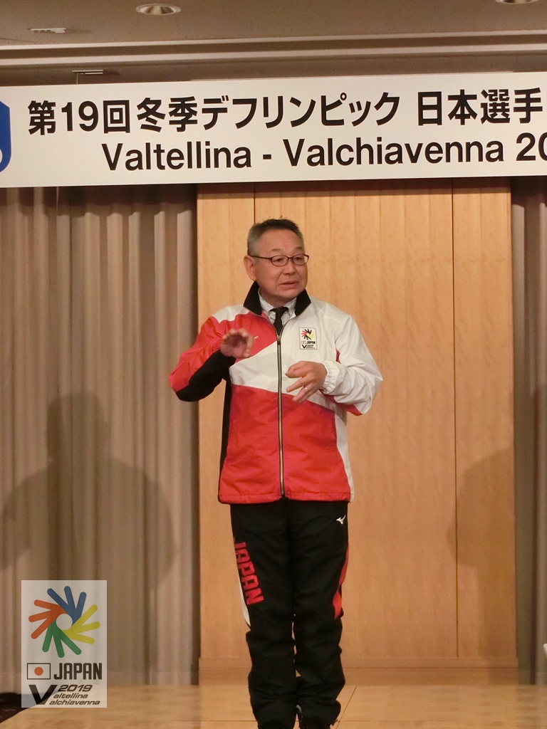 まず、主催として全日本ろうあ連盟デフリンピック派遣委員会 石野富志三郎委員長より「選手にはこれまでの練習の成果を発揮して前回大会以上のメダルを獲得する勢いで頑張って欲しい」と挨拶をしました。