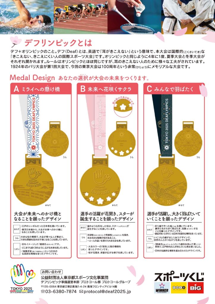 残り2週間!皆さまの投票お待ちしています!~大会メダルデザイン~ 2024 9/30 お知らせ 2024年9月30日 詳細はこちら>>メダルデザイン|東京2025デフリンピック 大会情報サイト (deaflympics2025-games.jp) お知らせ