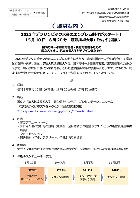 この度、2025年デフリンピック大会エンブレムを、国立大学法人筑波技術大学及び東京都と連携・協力しながら制作することになりましたので、お知らせします。 プレスリリースのダウンロード(PDF)
