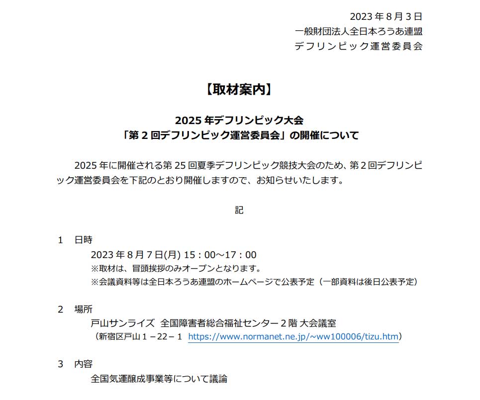 <取材案内>2025年デフリンピック大会「第2回デフリンピック運営委員会」の開催について
